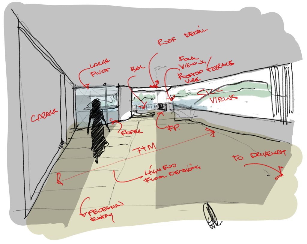 - Burumerring adopts a cascading floor plan, stepping with the terrain so each level maintains a direct connection to the ground. This creates a sequence of indoor-outdoor spaces anchored to the landscape. The design utilises the upslope nature of viewing the site to provide a dramatic roof form as a visual anchor point before quietly receding below