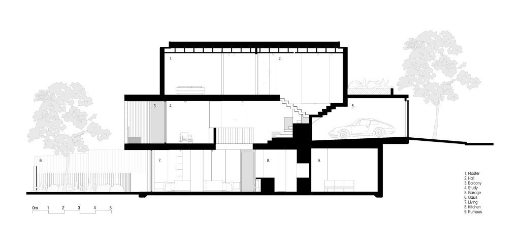 Nestled below the brow of a rolling escarpment Jin houses belies its steep site. The cross-site podium quietly anchors the build to the site from the public domain will acting as a viewing platform as the site drops sharply away. Its minimal site intervention retains the natural terrain and minimises site impact